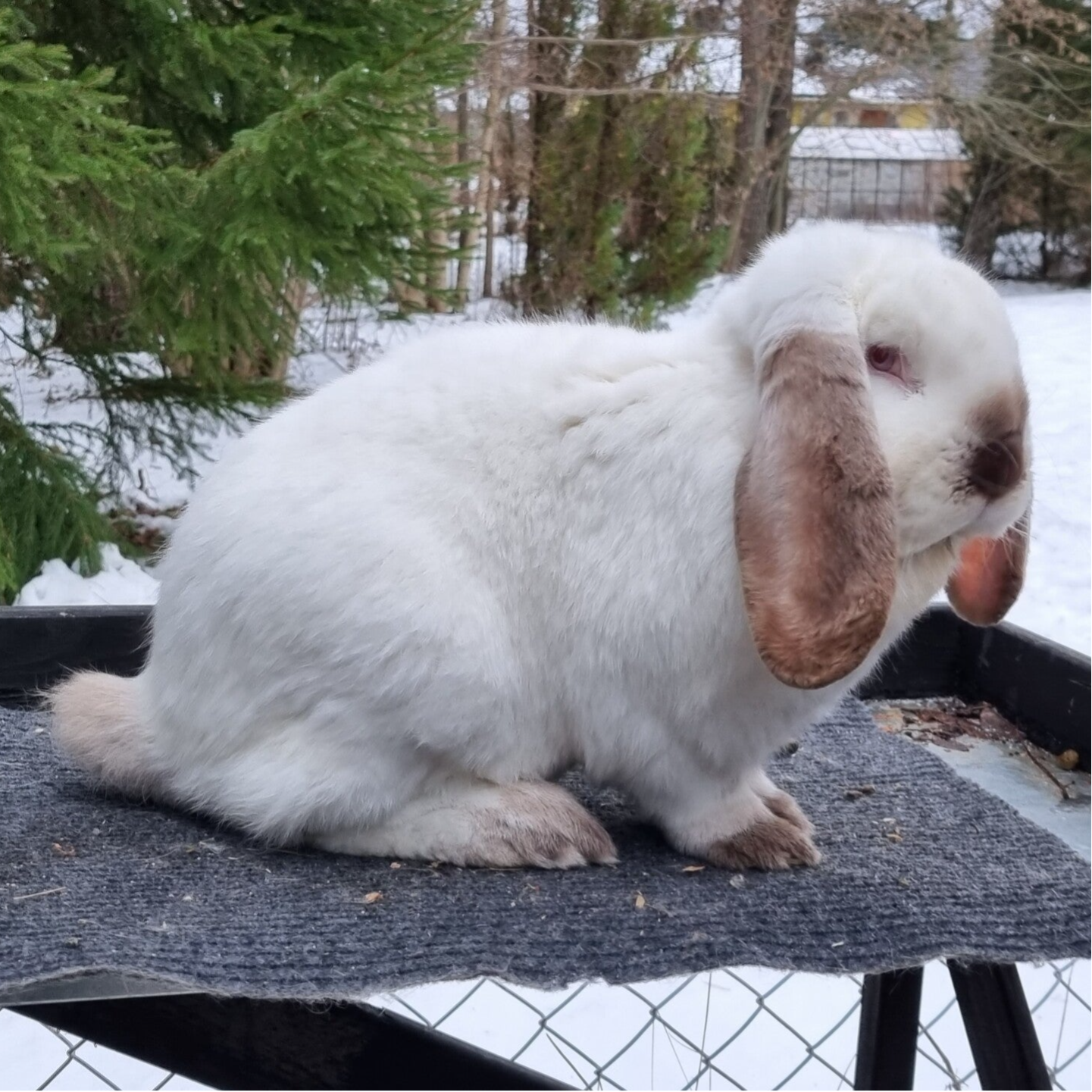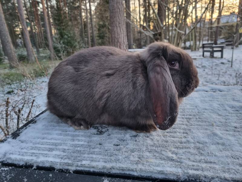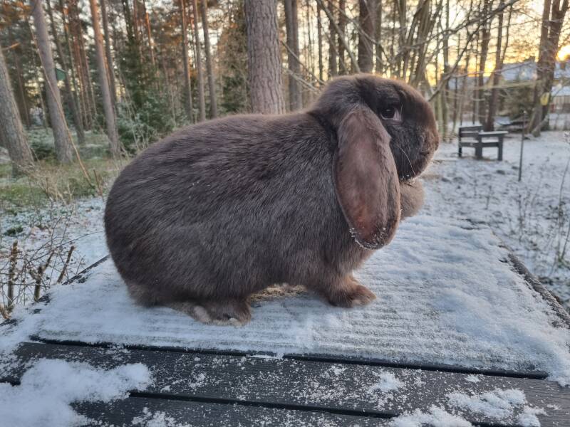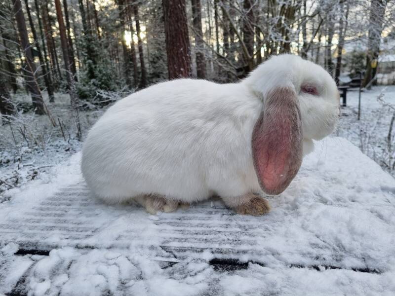 Franska väduren (eller frasse som dom kallas) är en av dom tre jätteraserna som finns i Sverige och den största vädursrasen. En rastypisk frasse ska väga minst 5,51 kg enligt standarden men det är inte ovanligt att dom väger mer. Trots sin storlek så är frassarna riktigt lugna och trevliga sällskapskaniner och brukar i mitt tycke vara en bra ras för familjer med barn eftersom det är lättare att lära barn att inte bära omkring på kaninerna om dom är stora och otympliga.